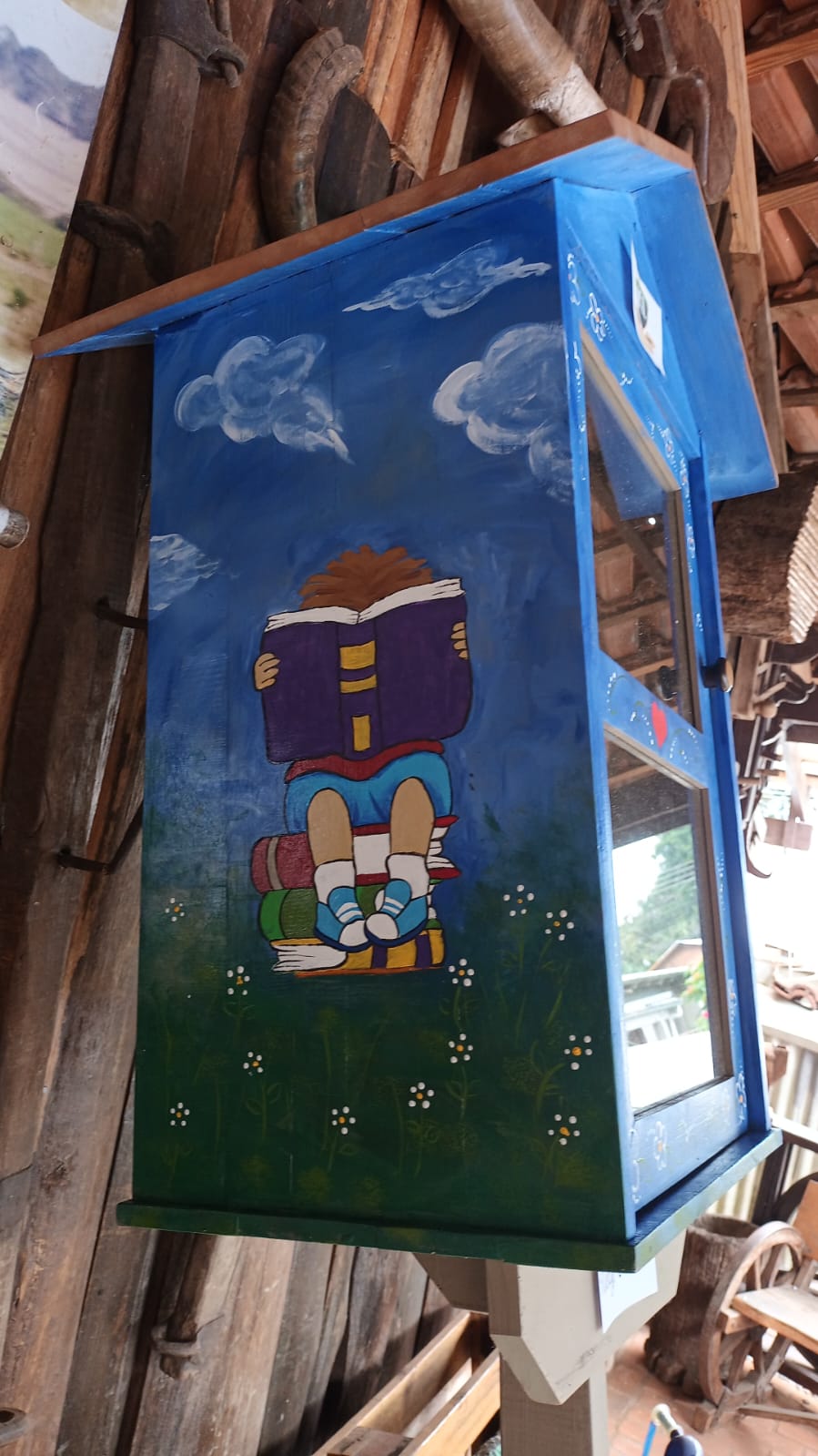 A pintura, feita com tinta acrílica e verniz, representa a importância da leitura e o universo de fantasia presente em cada história.