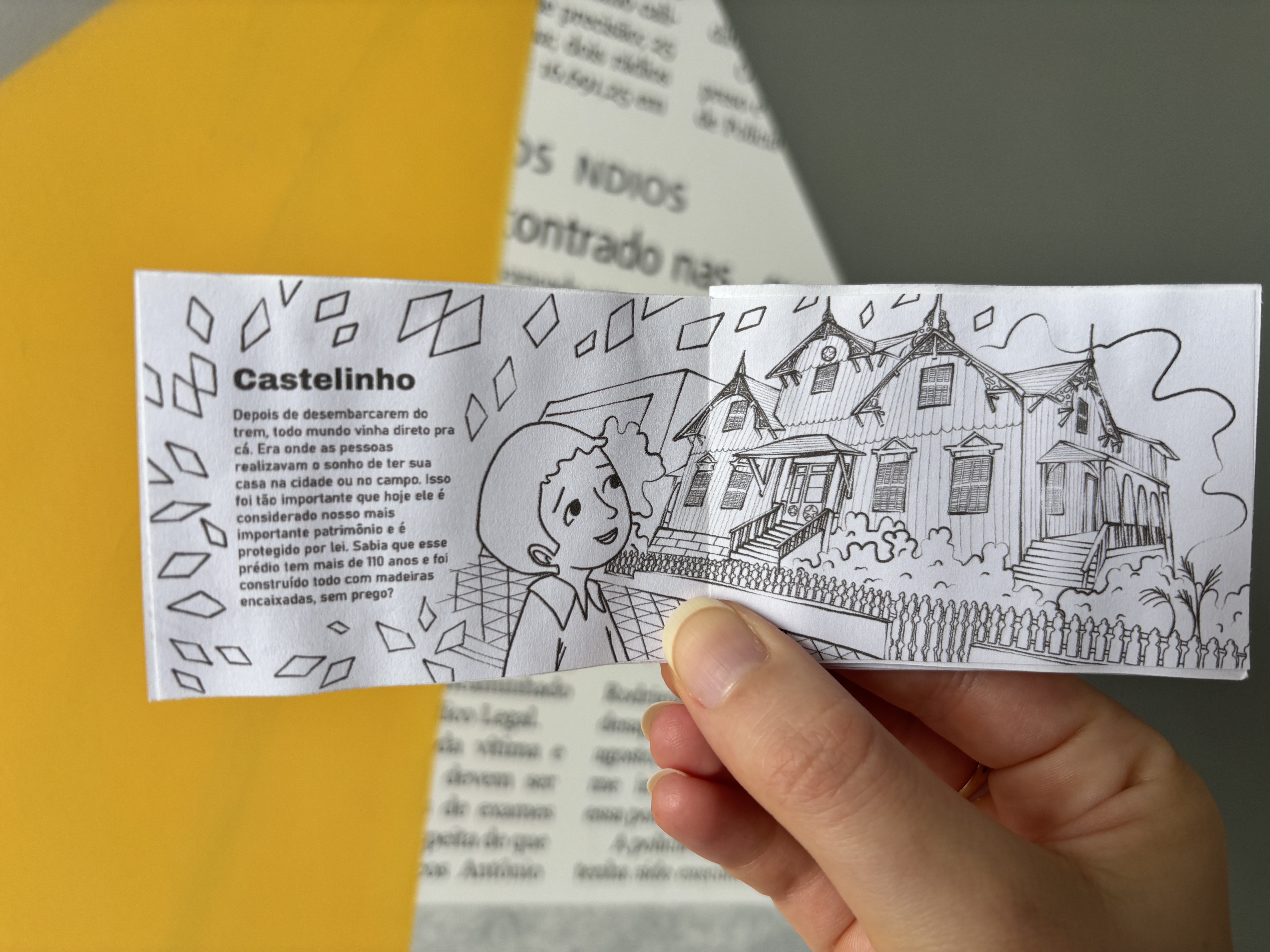 A construção do livro foi baseada em um percurso pela cidade, acompanhando o personagem jornaleiro por diferentes pontos de Erechim. Para isso, Laura realizou visitas e observações com o apoio da arquiteta especialista em patrimônio Ariane Pedrotti, que auxiliou na definição dos locais retratados. “A gente organizou um trajeto e fui até alguns desses lugares para observar melhor e construir as ilustrações”, explicou.